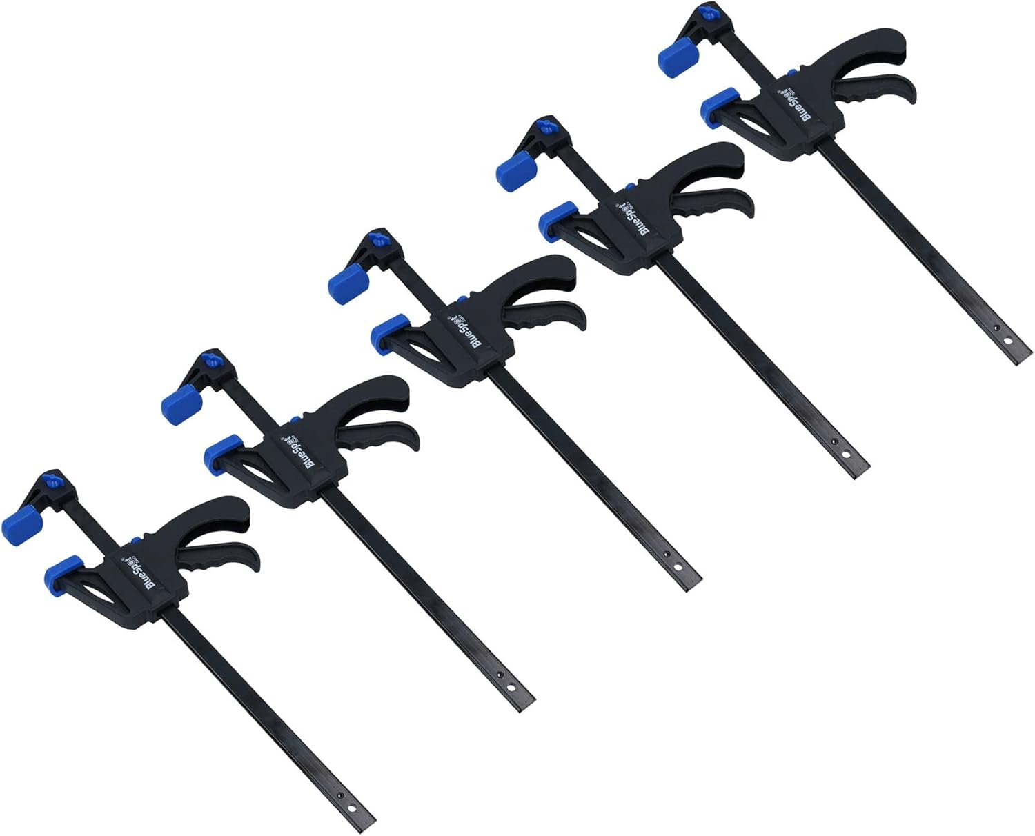 Professional ratchet speed clamp for commercial or occasional use Ideal for use when working with wood, metal or any other material that needs to be joined 12” quick release ratchet rapid bar clamp Quick speed trigger allows you to clamp your materials using one hand only Can also be used as a spreader tensioner to keep materials separated Easy to switch between clamp and spreading function by reversing the front jaw Strong and lightweight structure Removable pads if required Anti scratch plastic jaw guards protect the work surface being clamped Single handed operation Change to a spreader by simply unscrewing one side and fastening to the other Maximum opening of the jaw 12” / 300mm Heat treated clamping head for strength and durability Quick release button allows quick removal as well as expansion of the clamp without taking it apartSPECIFICATIONS Ratchet speed clamp and spreader Easy to switch between clamp and spreading Manufactured from durable reinforced nylon Non marking pads Maximum jaw opening – 12” (300mm) Maximum clamping pressure – 50kg This is a multi variation listing for 6 different pack sizes, simply click on the tab above to select the correct pack size required