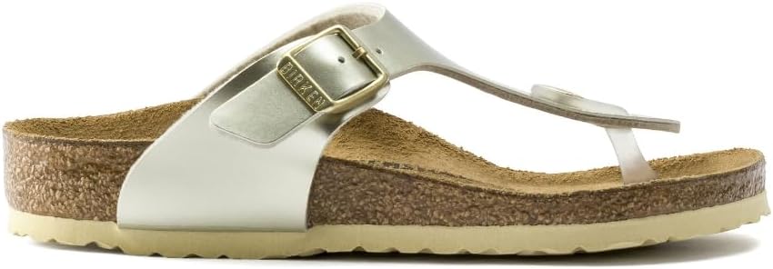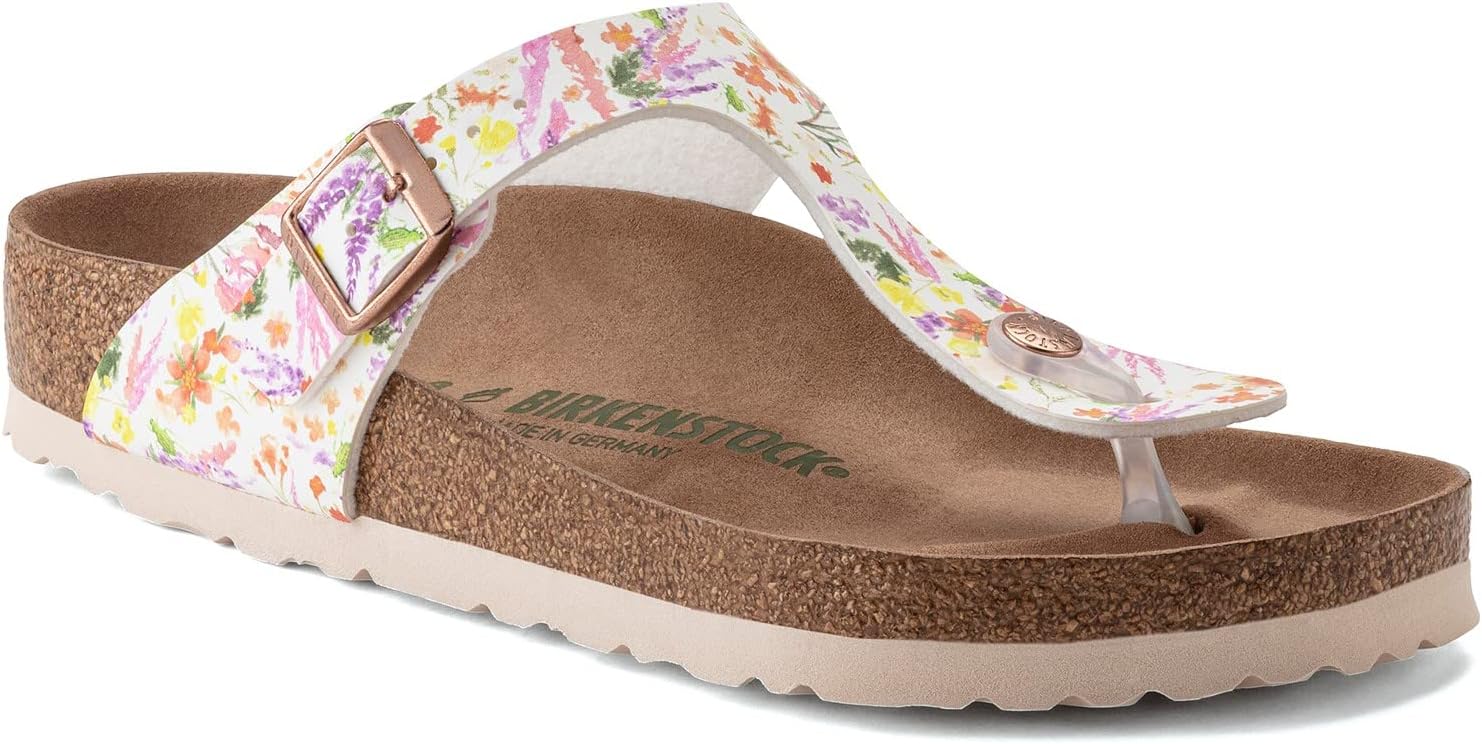 You'll love the colors and comfort of this classic Birkenstock style,the Birkenstock Gizeh Birko-flor. This women's thong sandal is set in a Birko-Flor upper,a unique material made of acrylic and polyamide felt fibers,a soft fabric with a smooth leather-like finish. Whether you are looking for color or shine for your Birkenstock sandal,you can count on the original Birkenstock footbed of sustainable cork,featuring pronounced arch support,a deep heel cup and a roomy toe box and covered with a 100% Suede liner. The footbed molds and shapes to your foot for unparalleled comfort. A true classic and icon of relaxed summer style,you'll love the Birkenstock Gizeh Birok-Flor. Click here to watch our very own Blair video review the Birkenstock Gizeh Birko-Flor for the Planetshoes.com blog! This is the real deal. Cork, leather, a buckle or two: these are the simple ideas that have made feet happy for over two hundred years, and that's the original Birkenstock. These shoes are made in Germany since 1774. No smoke, no mirrors, and no gizmos are needed. You walk, the shoe molds to your foot. The shape of the Original Birkenstock Footbed enables body weight to be distributed evenly over the whole foot, providing it with optimal support.
