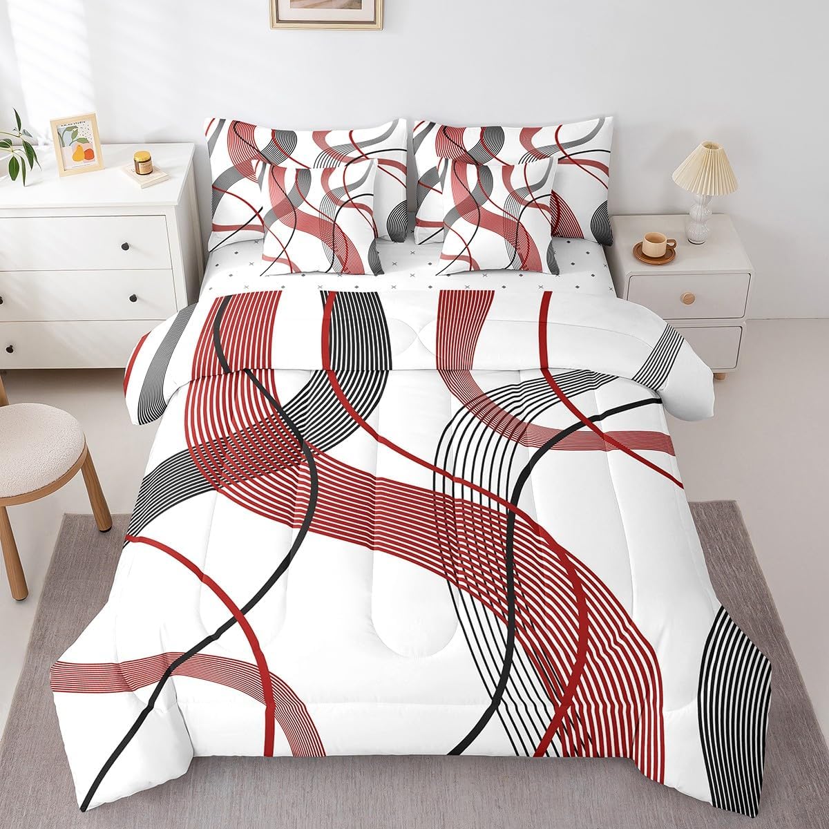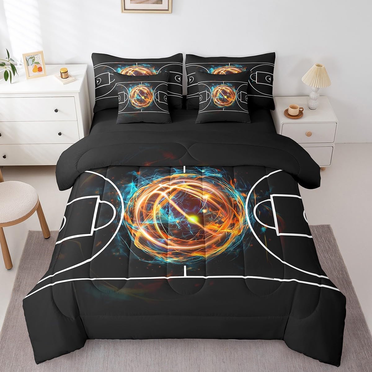 Welcome to our store. Size information: Twin size: 1 Comforter 68"W x 90"L and 1 Fitted Sheet 39"W x 75"L x 16"H and 1 Flat Sheet 67"W x 96"L and 2 Pillowcases 20" x 30" and 2 Throw Pillow Covers 18" x 18" . Full size: 1 Comforter 79"W x 90"L and 1 Fitted Sheet 55"W x 75"L x 16"H and 1 Flat Sheet 81"W x 96"L and 2 Pillowcases 20" x 30" and 2 Throw Pillow Covers 18" x 18" . Queen size: 1 Comforter 90"W x 90"L and 1 Fitted Sheet 60"W x 80"L x 16"H and 1 Flat Sheet 90"W x 102"L and 2 Pillowcases 20" x 30" and 2 Throw Pillow Covers 18" x 18" . King size: 1 Comforter 104"W x 90"L and 1 Fitted Sheet 78"W x 80"L x 16"H and 1 Flat Sheet 90"W x 106"L and 2 Pillowcases 20" x 36" and 2 Throw Pillow Covers 18" x 18" . Useful and practical: A luxurious product for homes,dorm rooms,hotels,guest rooms.Practical to use for being polyester, feels like cotton which is super soft and breathable.No chemicals used, no dye substance harming the health of you or your family. Unique design: Vivid Colors won't fade thanks to new 3d digital printing methods. These unique designs match well with various color palettes of your rugs, curtains, headboard, furniture, and all other decor accessories. Washing instructions: Machine wash it in cold water without bleach,and tumble dry on low heat to restore its freshness and appearance.