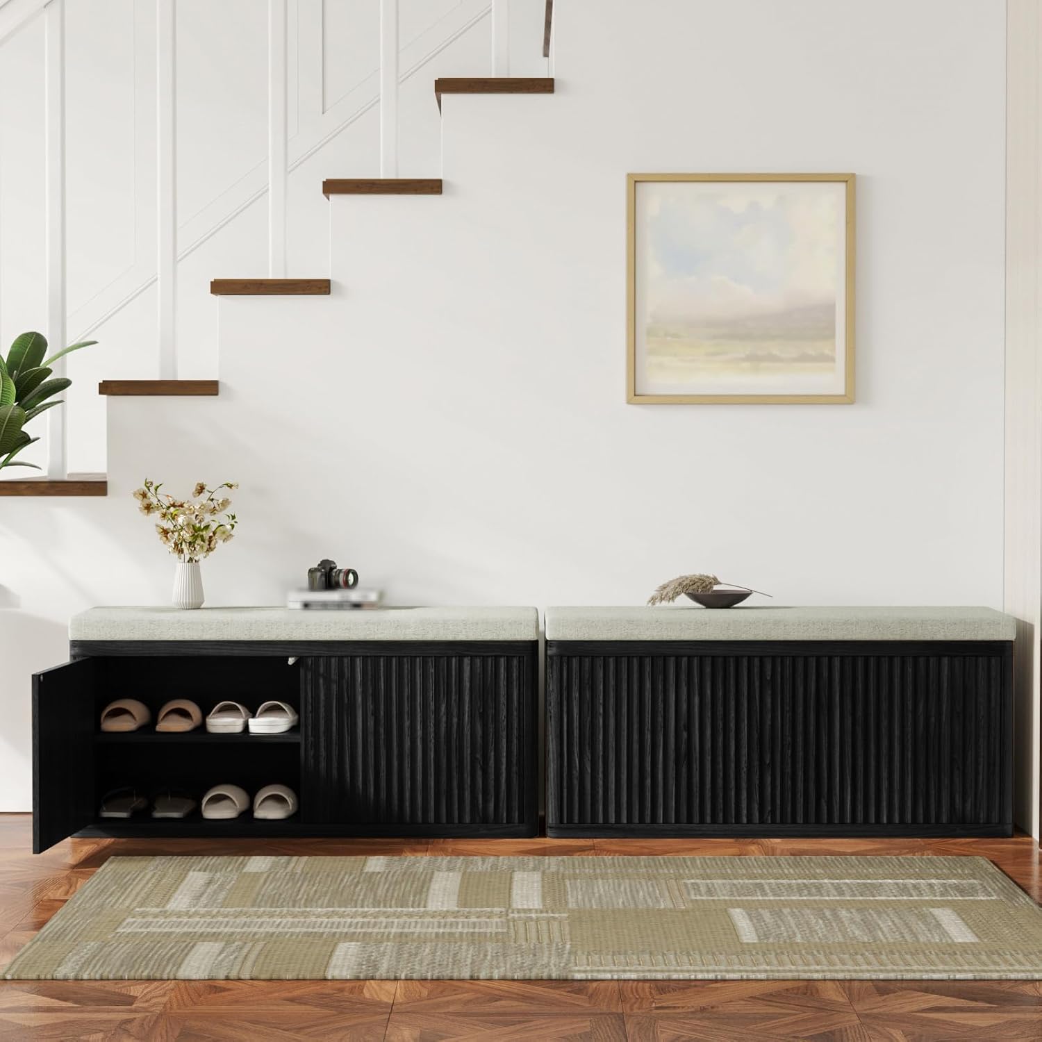 【Upgrade Your Entryway — Smart, Safe & Stylish Storage Bench】 Tired of cluttered entryways and boring storage solutions? Meet the Wave Panel Shoe Storage Bench — where modern design meets practical living. Engineered with a smart push-open system, a 5cm high-resilience cushion, and a child-safe build, this bench isn’t just furniture — it’s your newest home essential. Push-Open, No-Handle Design A gentle press is all it takes. No knobs, no handles — just smooth, effortless access. Perfect for narrow halls and homes with kids. Cloud-Like Comfort, Built to Stay Put Sink into the 2 inches thick high-resilience cushion — firmly anchored, never slips. Perfect for lacing up or taking a moment to relax. Wave Panel Style | 3 Modern Finishes Upgrade your space with flowing wave-panel detailing. Choose from Walnut, Light Oak, or Black — each crafted to elevate modern, Scandinavian, or minimalist interiors. Hidden Yet Huge Storage Don’t let the slim profile fool you — inside lies a spacious compartment that fits multiple pairs of shoes, bags, or household essentials. Rounded Corners & Sturdy Build We designed this bench like we’d design for our own homes — with softly rounded edges, strong engineered wood, and a footprint that stays put. Your Order Includes & Guarantee 1x Wave Panel Storage Bench with Cushion Easy-to-follow assembly instructions & hardware Available in Walnut, Light Oak, or Black We stand behind our quality with responsive customer support. Click Add to Cart now and transform your hallway, bedroom, or entryway with confidence!