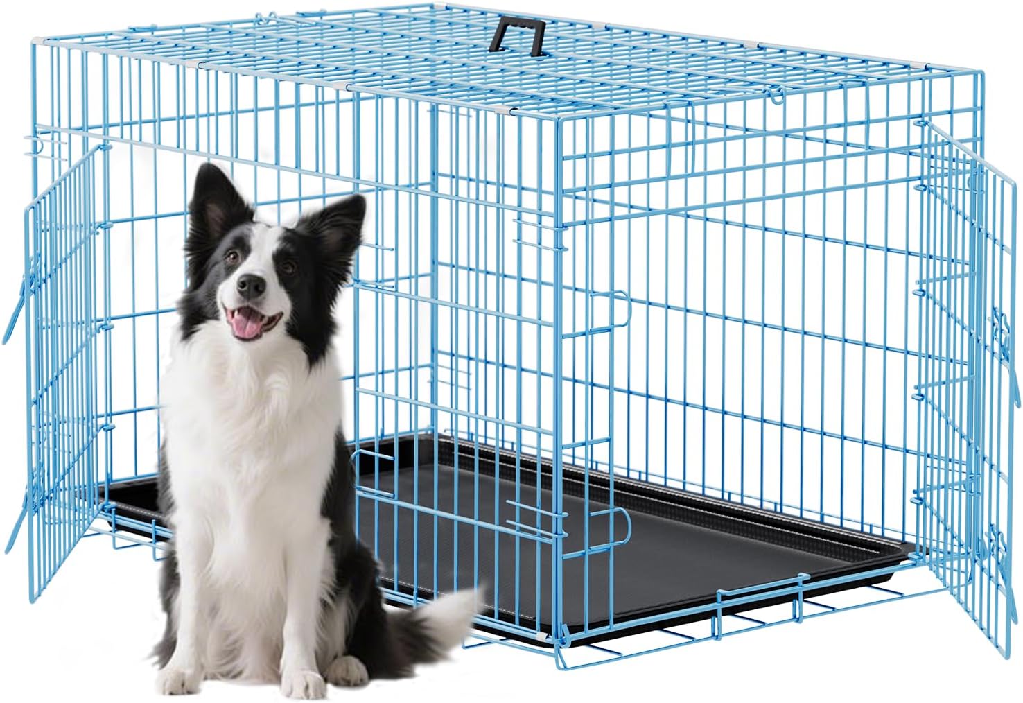 This dog cage dog crate is a warm haven that your pet will adore, not simply a place to imprison them. The powder-coated black metal frame is strong enough to resist even the most voracious chewers, yet it also lets in plenty of air and keeps your dog feeling safe. It's effortless to engage with your dog or arrange the crate in the most convenient location in your home thanks to the double doors with safe locks that provide easy access from the front or side. A detachable plastic tray within gathers spills and simplifies cleanup. The kennel folds down fully for convenient storage or transportation after fun, making it ideal for travel or adventures with your pet.