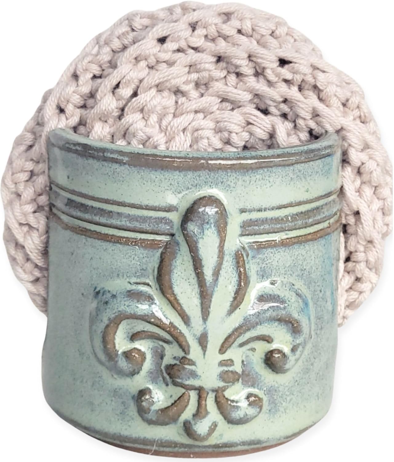 Complete your kitchen washing station in farmhouse style with this handmade Fleur De Lis sponge holder. Made on a pottery wheel and finished by hand. Use to store and dry your sponge between uses. Keep your sponge fresher longer. Several color options make this a nice fit your kitchen décor. This fits a standard kitchen sponge (not included). These are handmade stoneware. This listing is for one fleur de lis sponge holder the white glaze shown. The item you will receive is not the actual item pictured. These are handmade and slight differences will occur. Natural variations in glaze color and slight variations of form are what will make the piece you receive unique! This item is on hand and ready to ship. Measurements: approximately 2.75" tall x 3" diameter *Your purchase supports living wages for Aour makers. Thank you!