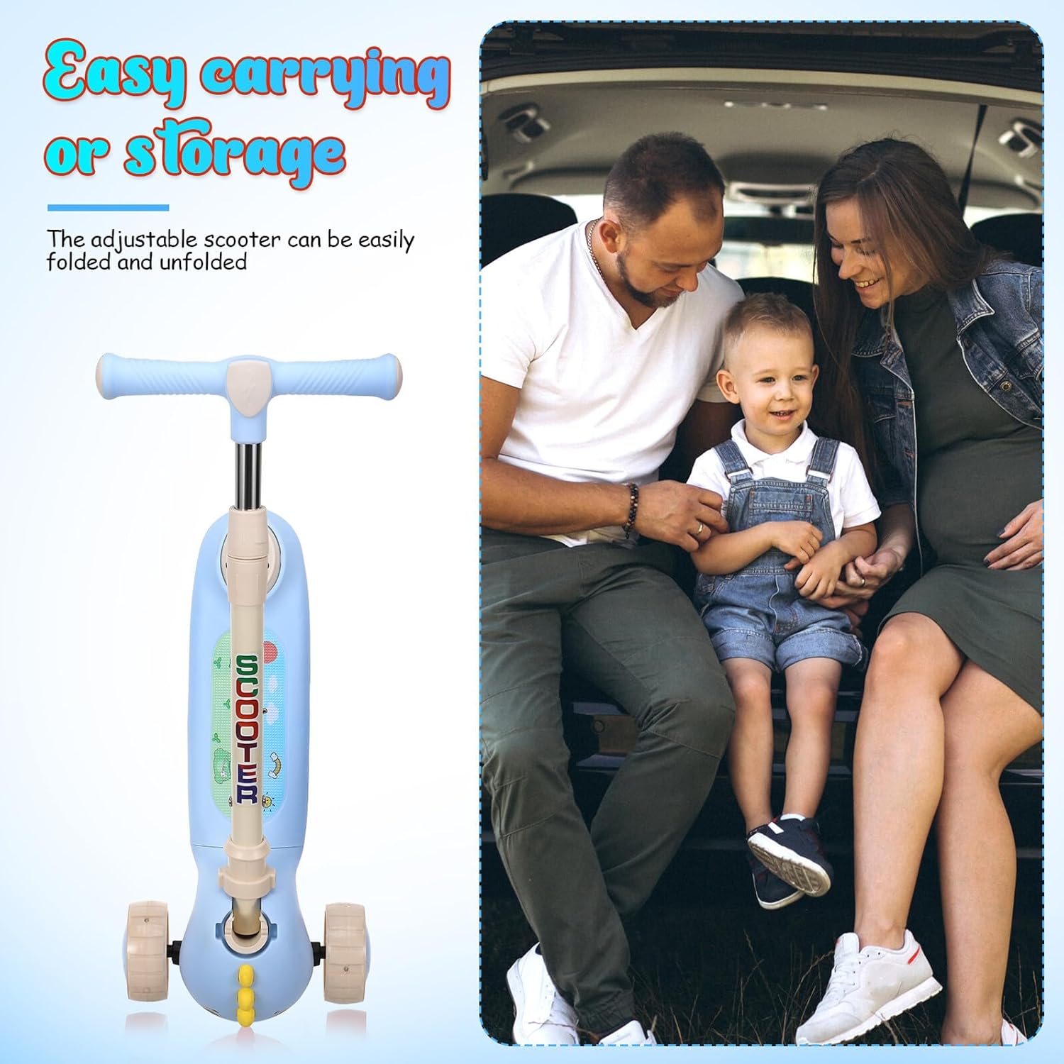 Package List 1 scooter 1 packaging bag 1 x packaging box Features -Product Info: scooters -Portable folding mechanism: The foldable scooter enables quick folding for easy portability and efficient storage in small areas foldable scooter -Material:Plastic, metal three wheel scooter -Flashing effects: The inclusion of flashing this scooter adds an interactive and joyful dimension to the activity, easy to engage young kick scooter for -Ergonomic handlebar adjustment: This scooter includes an adjustable handlebar that can be set to different heights, accommodating a range of heights foldable scooter for boys -Tough and reliable build: Engineered for strength, this scooter stands against the challenges of outdoor play, enduring impacts for - Color: Sky-blue -Outdoor play: By providing an engaging outdoor activity, this scooter helps essential skills like balance and coordination foldable scooter for -Power supply: 2*AA batteries required(not included) light-up kick scooter - Size: 63.00X53.00X26.00cm/24.76X20.83X10.22in foldable scooterGoods Informationfoldable scooter for outdoor play The vivid colors and adorable design make it an attractive that will love.Three Wheel Scooters The folding mechanism makes it easy to fold and unfold the scooter without assistance. scooter with adjustable handlebar The adjustable handlebar allows the scooter to grow with your , providing an enjoyable riding experience