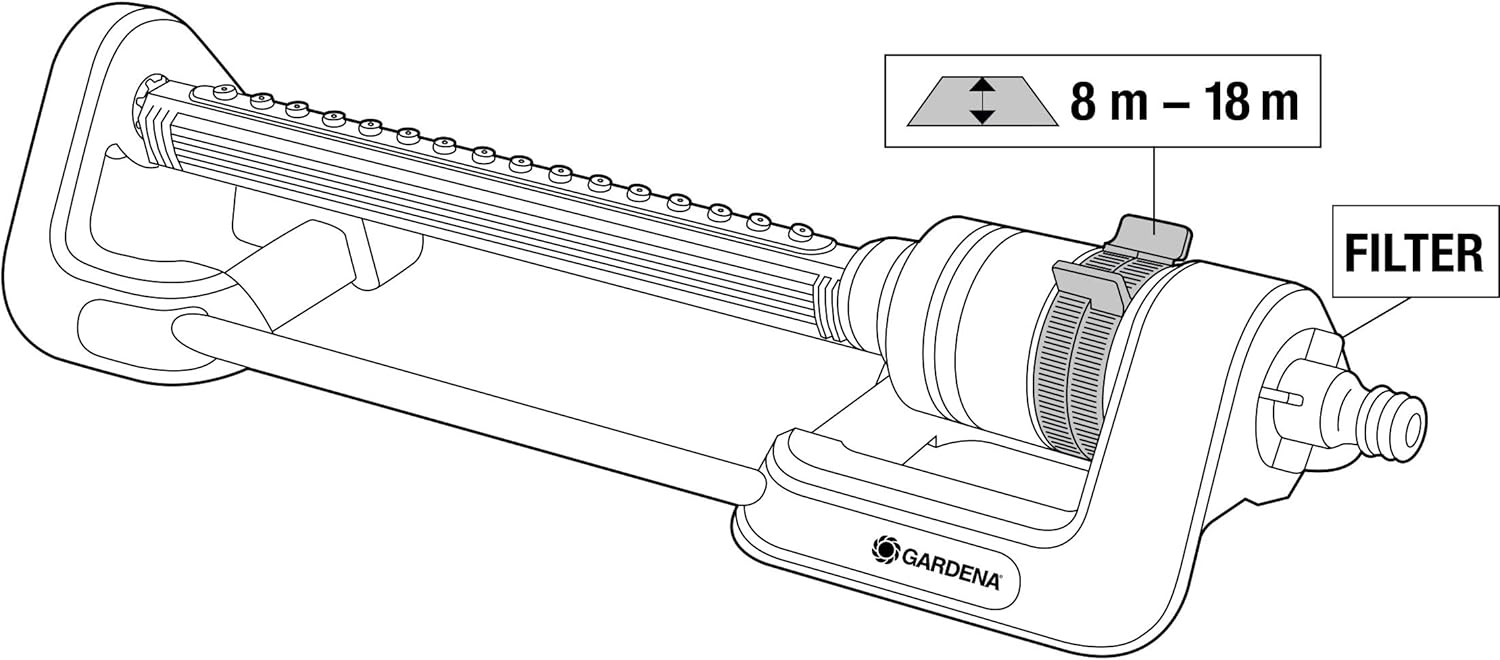 The Gardena Aqua L rectangular sprinkler – reliable and even watering for large lawns | This long-lasting lawn sprinkler is especially good at irrigating rectangular and square gardens, providing even results with no puddles. Conveniently water garden areas from 120 m² to 280 m² to keep your lawn looking lush and green even during dry weather spells. Connect the sprinkler effortlessly to any Gardena hose. You can intuitively adjust its range from 8 to 16 m. Robust and durable: The robust material includes metal elements to ensure that the sprinkler is stable. and with a five-year warranty. Frost-proof. The internal filter on the water connection is made from stainless metal and can be easily removed, making cleaning a breeze. You can use the cleaning needle to unclog any limescale deposits in the spray nozzles. and with a five-year warranty. Frost-proof. Gardena – garden owners have trusted original Gardena irrigation systems for decades.