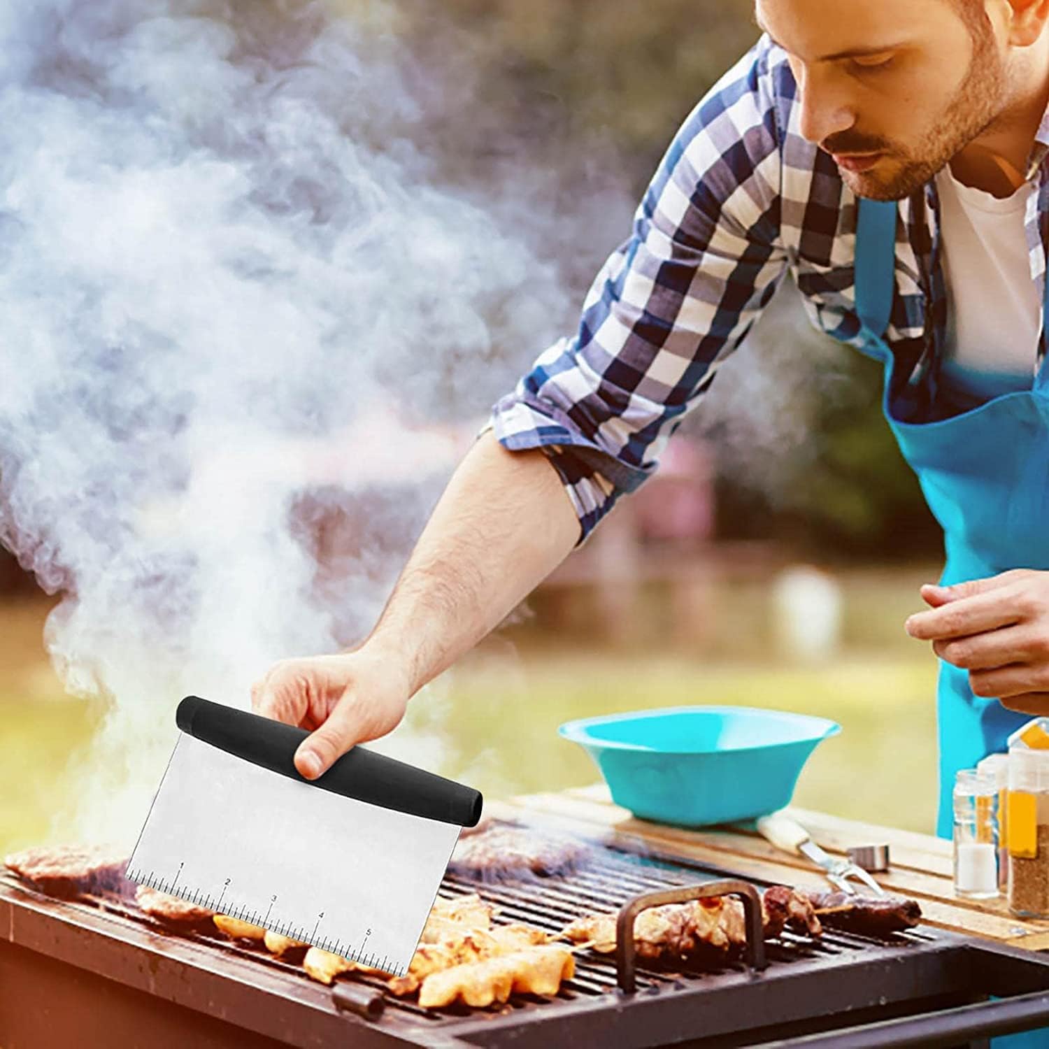 Product Specifications: Product material: Silicone + stainless steel + PP plastic Steel thickness: 1.2mm Package Included: 1 set of barbecue tools (14 pieces): 2 oversized spatulas, 1 barbecue spatulas, 1 graduated chopping scraper, 2 sauce bottles, 1 cleaning spatula, 1 cleaning brush, 1 dry pan tong, 4 egg rings (3.5"), 1 carrying bag