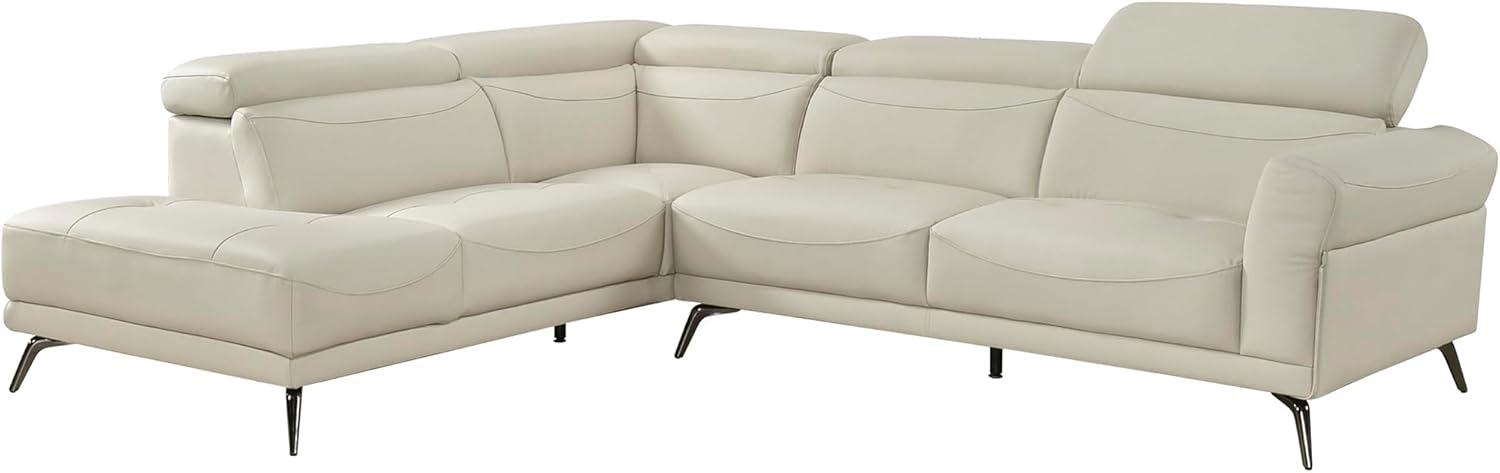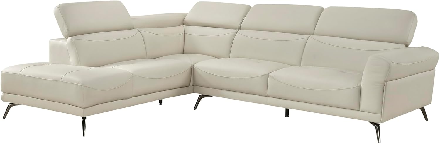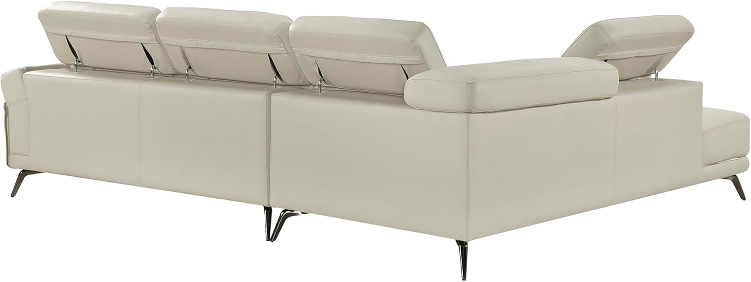 Redefine your living space with this sleek and sophisticated sectional featuring a left-side chaise-perfect for lounging in style. Expertly crafted with a solid wood and plywood frame, it offers lasting durability and support. The luxurious feel of 100% top grain leather where your body touches is complemented by faux leather accents, combining elegance with practicality. Sink into Dacron-wrapped high-density seat cushions and enjoy the comfort of attached back and seat cushions that maintain their shape over time. Adjustable headrests provide personalized support, while striking black chrome-finished metal legs add a modern edge. This two-piece sectional-left chaise and right 2-seater-is where comfort meets contemporary design.