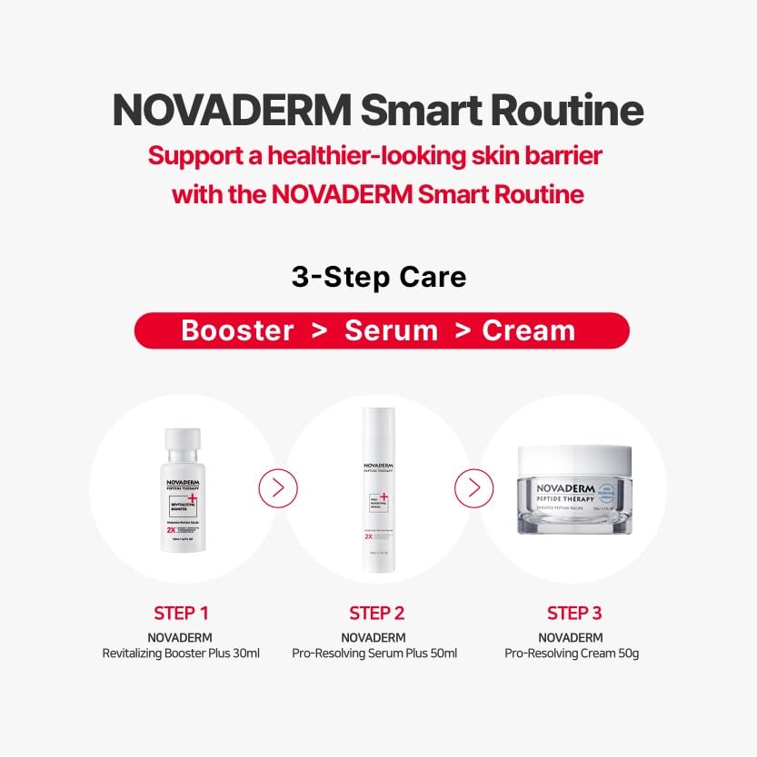 NOVADERM Peptide Therapy Revitalizing Booster Plus is a premium skincare booster formulated with a high concentration of globally patented peptide ingredients. Developed through advanced research, this lightweight yet powerful booster enhances skin hydration, supports elasticity, and improves overall skin appearance. Key Features: - Advanced Peptide Technology: Infused with NCP112, a globally patented peptide that helps improve skin hydration (+17.4%) and supports a more radiant complexion. - Deep Hydration & Elasticity: Contains twice the concentration of NCP112 compared to standard serums, promoting long-lasting hydration and enhanced skin elasticity. - Nourishing Formula: Enriched with turmeric root extract and probiotic ingredients, known for their skin-conditioning benefits and revitalizing properties. - Soothing & Gentle: Designed to provide skin comfort with a non-irritating formula, suitable for all skin types. - Fast-Absorbing & Lightweight: A rich, milky-textured booster that absorbs quickly into the skin, making it ideal for layering with other skincare products. Perfect for those looking to boost their skincare routine with deep hydration, improved elasticity, and a more radiant complexion. Suitable for all skin types.