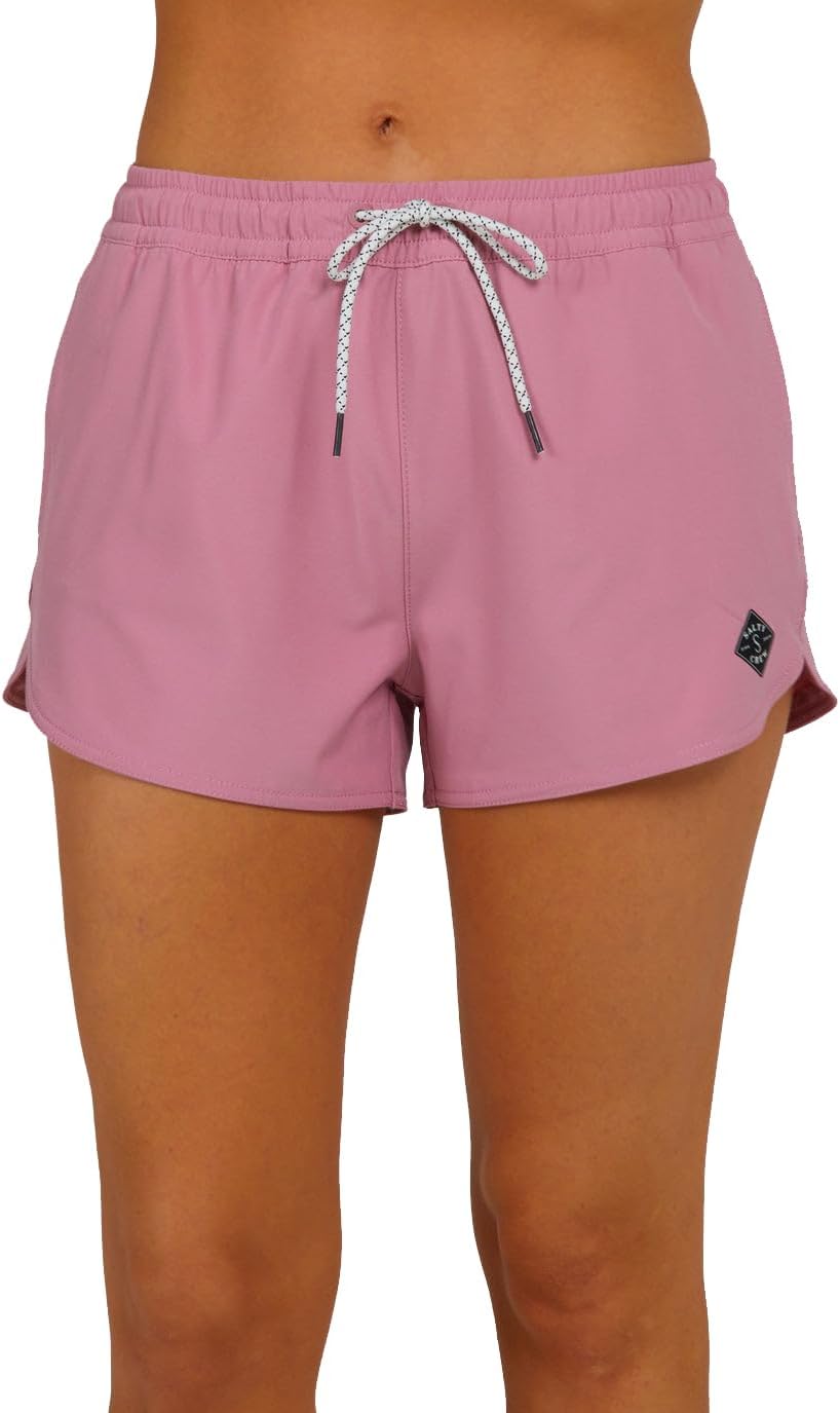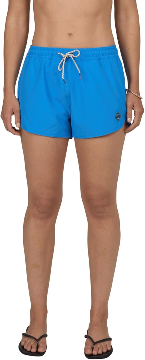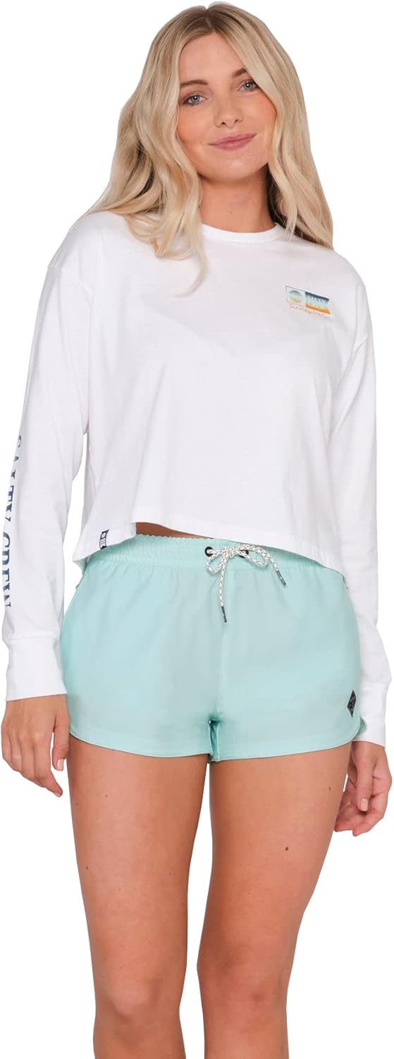 Salty Crew Womens Beacons Short features a scallop hem short with an elastic waist, drawcord, front inseam pocket, rear patch pocket, shock cord, drain hole, and Velcro closure.