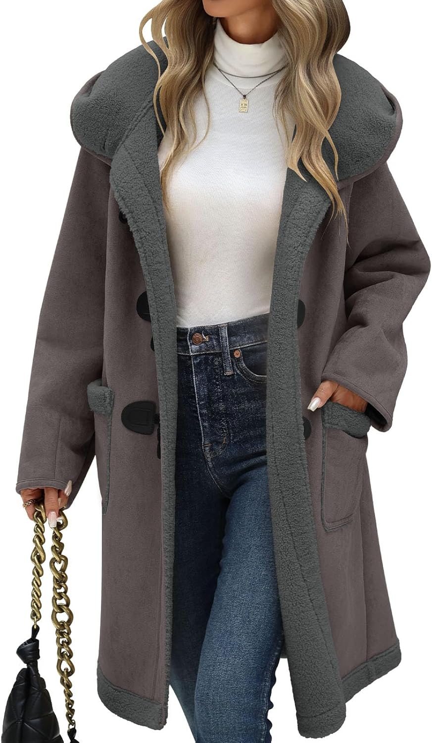 At UMIPUBO, we aim to design clothes that are not only fashionable but also warm and comfortable for our customers. We believe that fashion should never come at the expense of comfort, and our pieces are crafted to make you look and feel your best, no matter the occasion. The UMIPUBO Women's Fleece-Lined Sherpa Jacket—the perfect mid-length hooded toggle duffle coat for fall and winter is precisely a true embodiment. This coat, totally made of 100% polyester, features a premium suede fabric outer layer and a plush sherpa fleece inner lining, offering unbeatable softness, durability, and exceptional warmth to keep you cozy during chilly days. Designed with both style and practicality in mind, this trendy outerwear features a fashionable hooded design and fleece trim on the pockets and back, adding a touch of casual elegance. The overall tailoring is designed to naturally fit the body shape, balancing both elegance and casualness. Attention to detail is evident with three distinctive toggle fastenings, a vintage-inspired round button at the collar, and two convenient straight pockets for storing small essentials. Its versatile design and easy-to-match colors make it a breeze to pair with jeans, skirts, or leggings, allowing you to showcase your unique charm in any setting — whether you're shopping, on a date, commuting, or running errands. It's machine washable at a maximum temperature of 40°C. Just avoid bleach, use low-temperature ironing if needed, and do not dry clean. For the perfect fit, be sure to consult our detailed size chart.